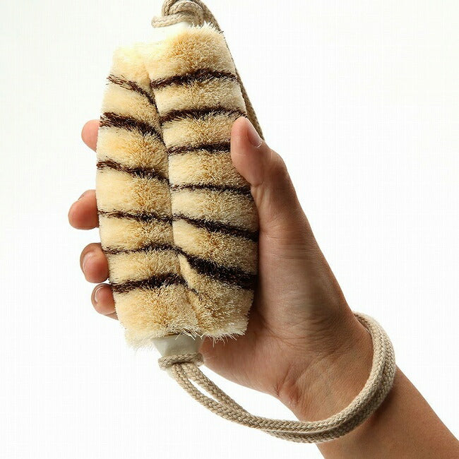 タムラさん(ひも付)は、やや大きめのたわしに背中洗いに便利な紐を付けたタイプ。